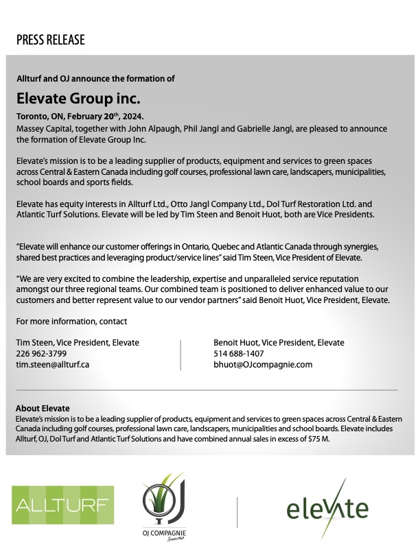 Elevate has equity interests in Allturf Ltd., Otto Jangl Company Ltd., Dol Turf Restoration Ltd. and Atlantic Turf Solutions. Elevate will be led by Tim Steen and Benoit Huot, both are Vice Presidents.